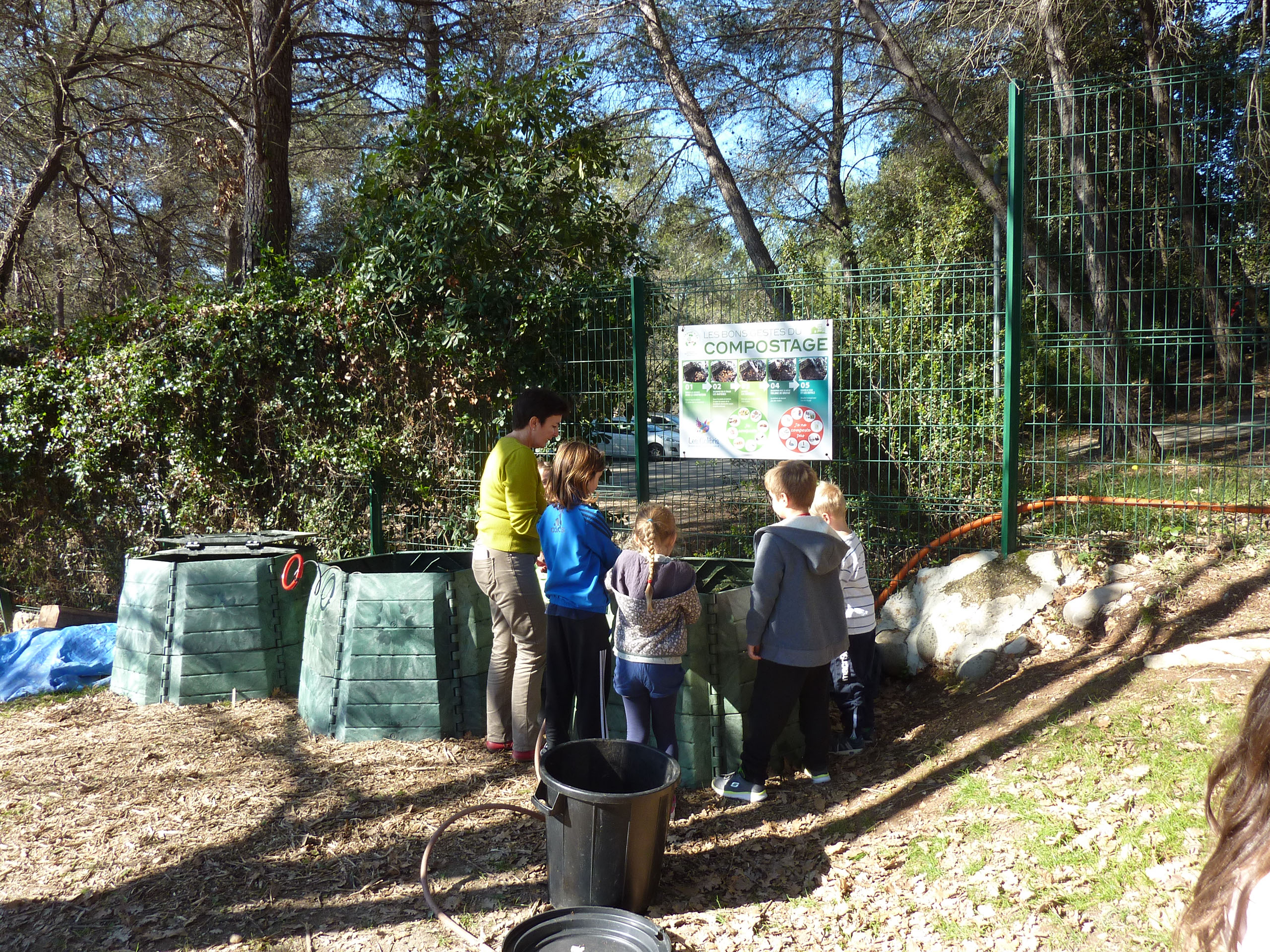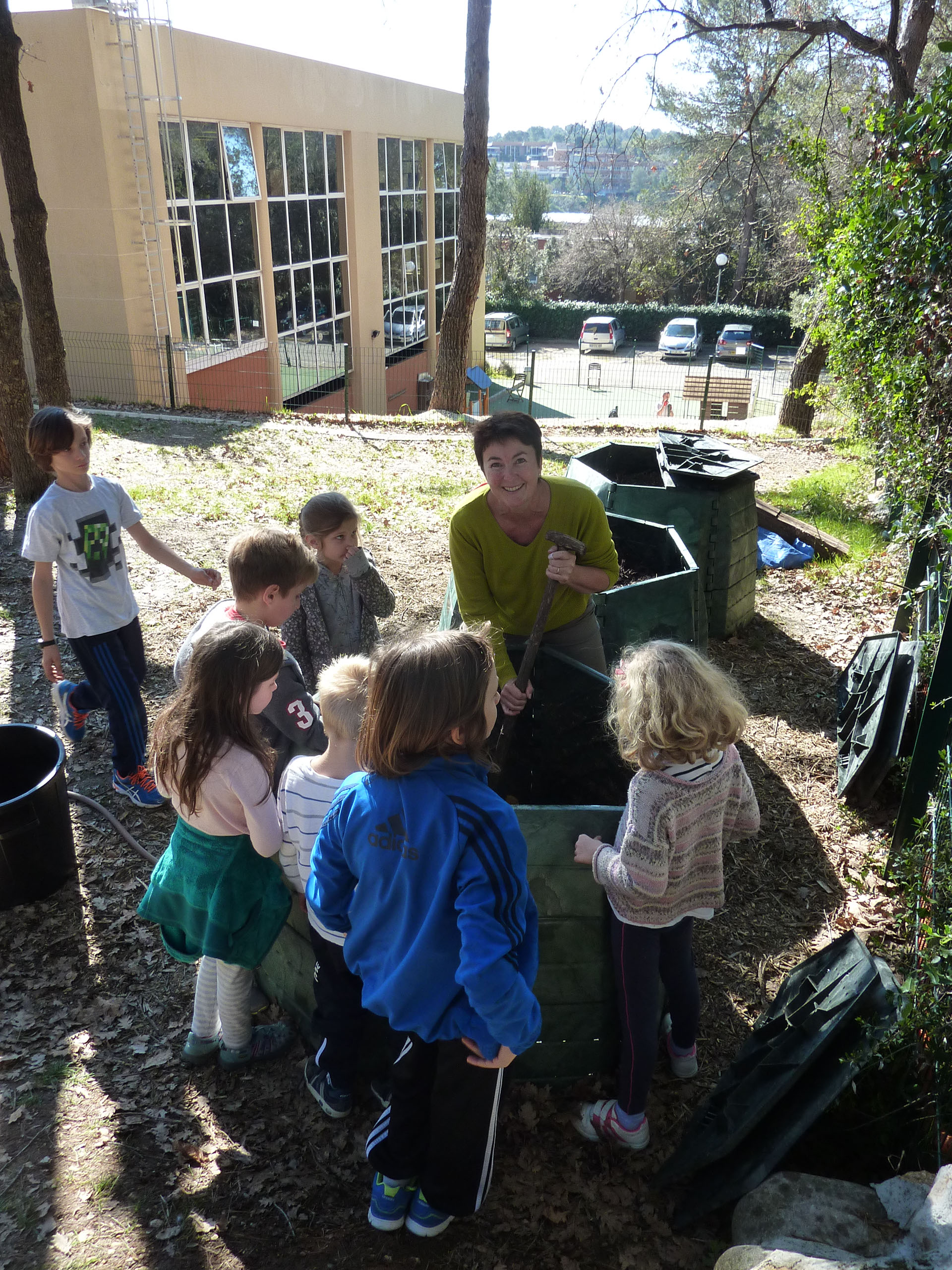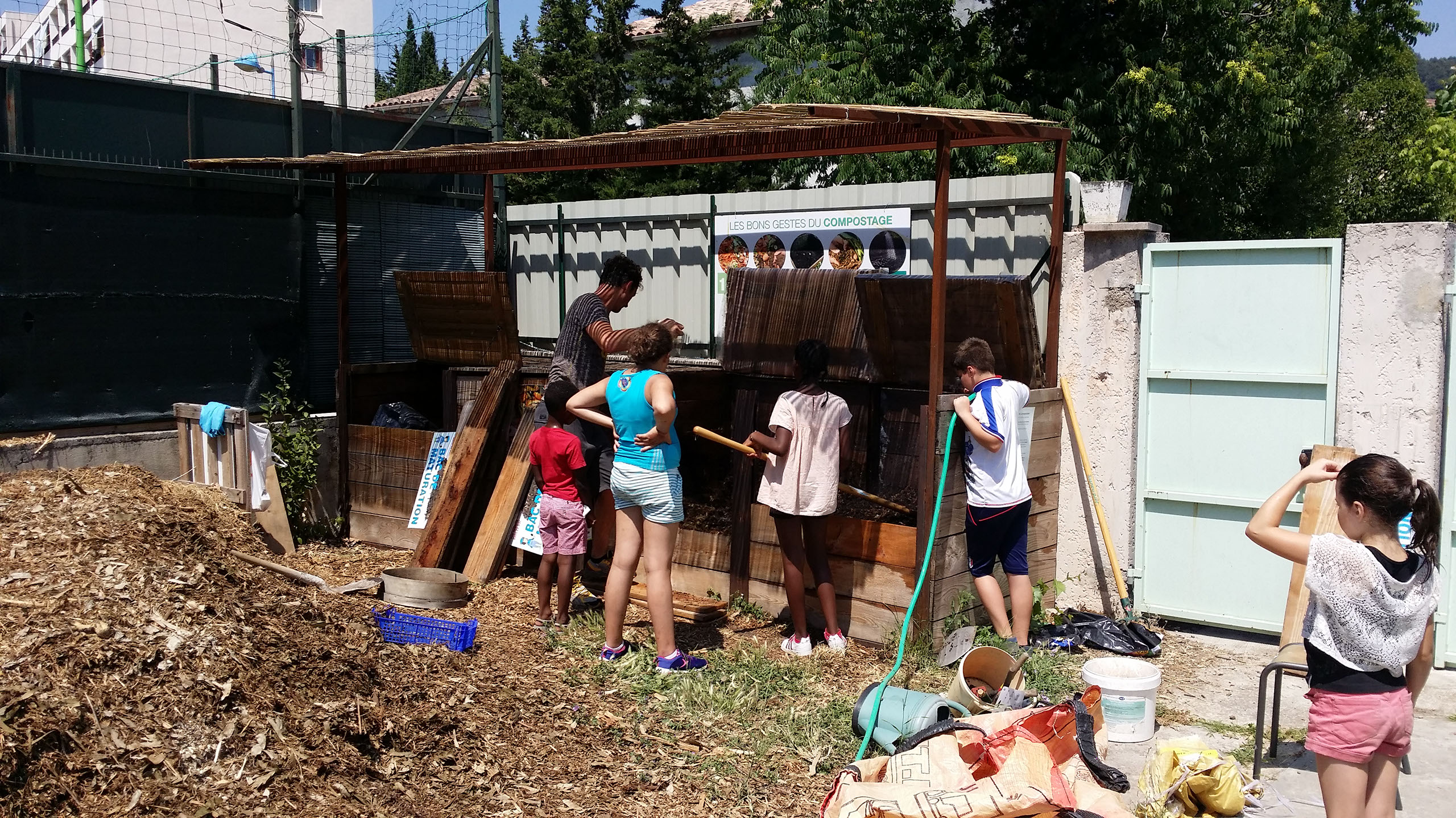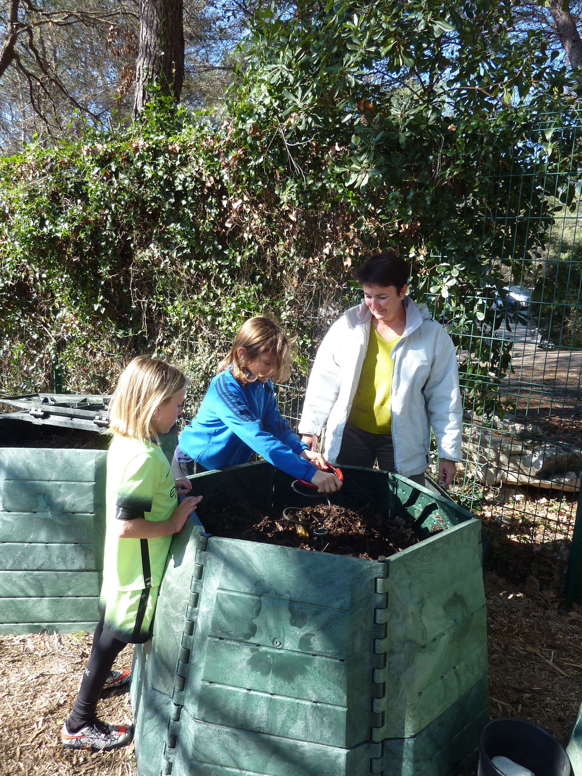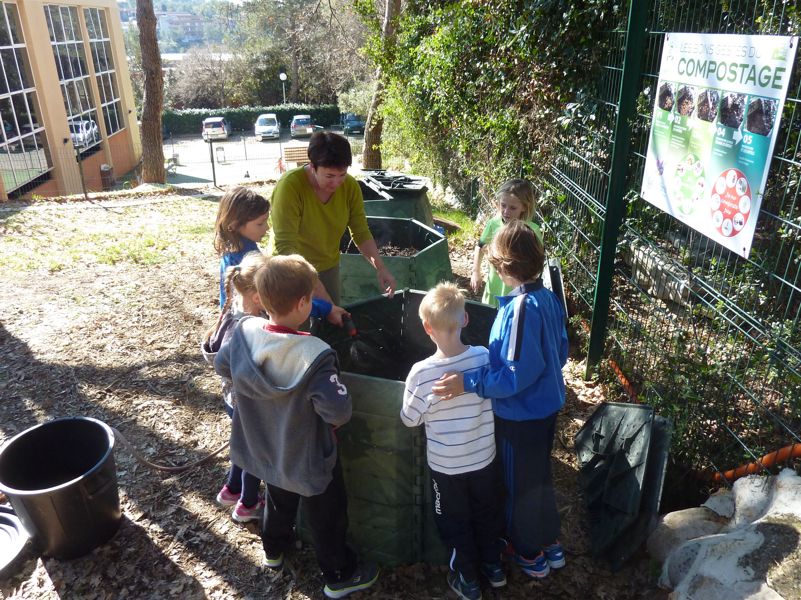 Installation de composteurs à l’école Montessori « Les Colibris » de Biot. Le tri des restes de repas est fait dès le plus jeune âge.